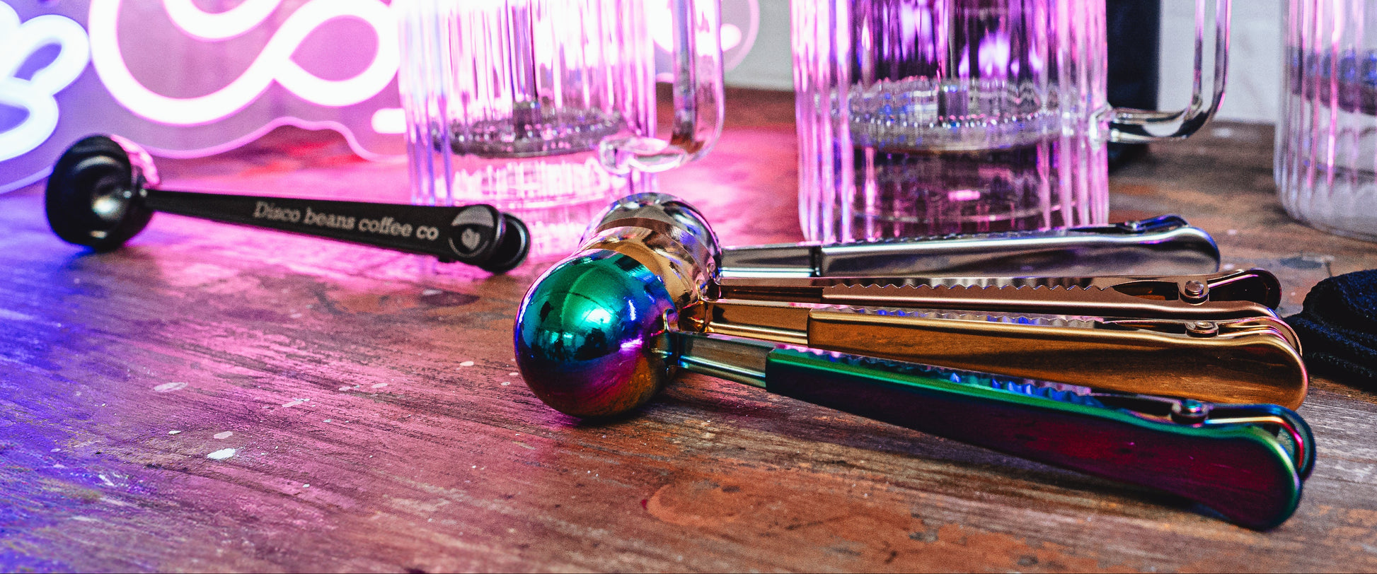 Extra clippy coffee bag clip & scoop - metal! Some extremely cool colours available: Oil Slick, Black, Silver, Gold and Rose Gold... All very disco!